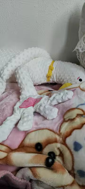 Il pupazzo è realizzato in morbidissimo tessuto Minky in poliestere, con imbottitura soffice e leggera per offrire comfort e una piacevole sensazione al tatto
